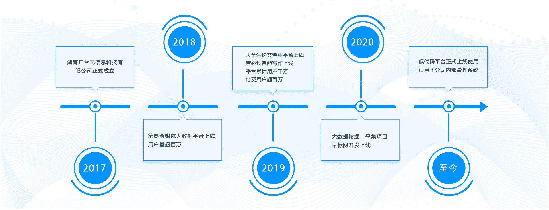 湖南正合元信息科技有限公司成立于2017年是一家以最新软件工程技术、大数据技术为中心的 互联网整体解决方案服务商 正合元科技主要提供应用软件开发(网站、微信小程序、抖音小程序、APP等)、大数据应用平 台(分布式系统、搜索引擎、数据中台、数据可视化等)开发等相关技术服务,帮助企业、政府做 全方位的大数据资产化、系统智能化建设,围绕企业信息化搭建高效的信息流通平台,提升企业整 体有机运作,加强企业的信息化竞争力,将互联网数字化、智能化信息建设与企业的运营深度融合, 并加强大数据建设,真正做到实时数据监管、以数据分析辅助企业决策,使得企业管理层运筹帷幄、 决胜千里。